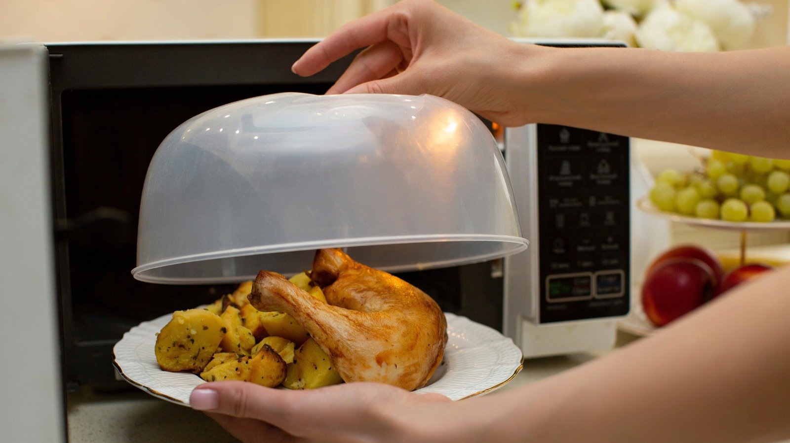 A woman with a microwave